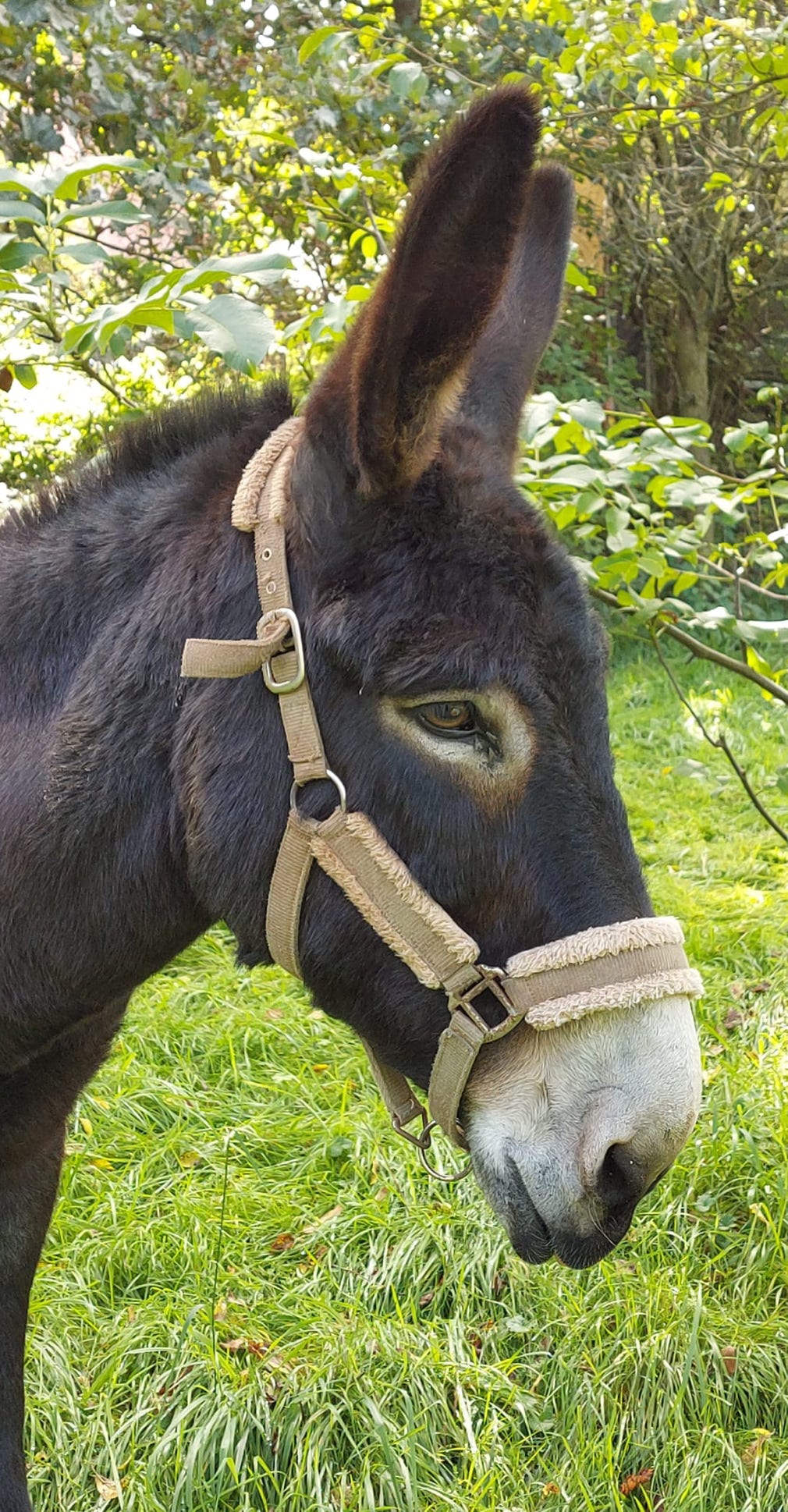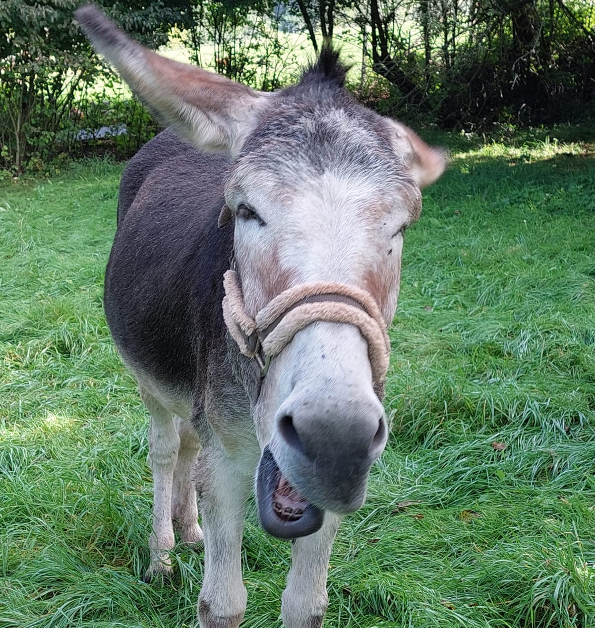 Gestatten, das ist Ali. Er ist der aufmerksame Chef im Ring und gibt auch das Tempo vor. Körperlich gesehen ist er ein dunkelbrauner, schlaksiger Groß-Esel mit den passenden mega-langen Ohren.